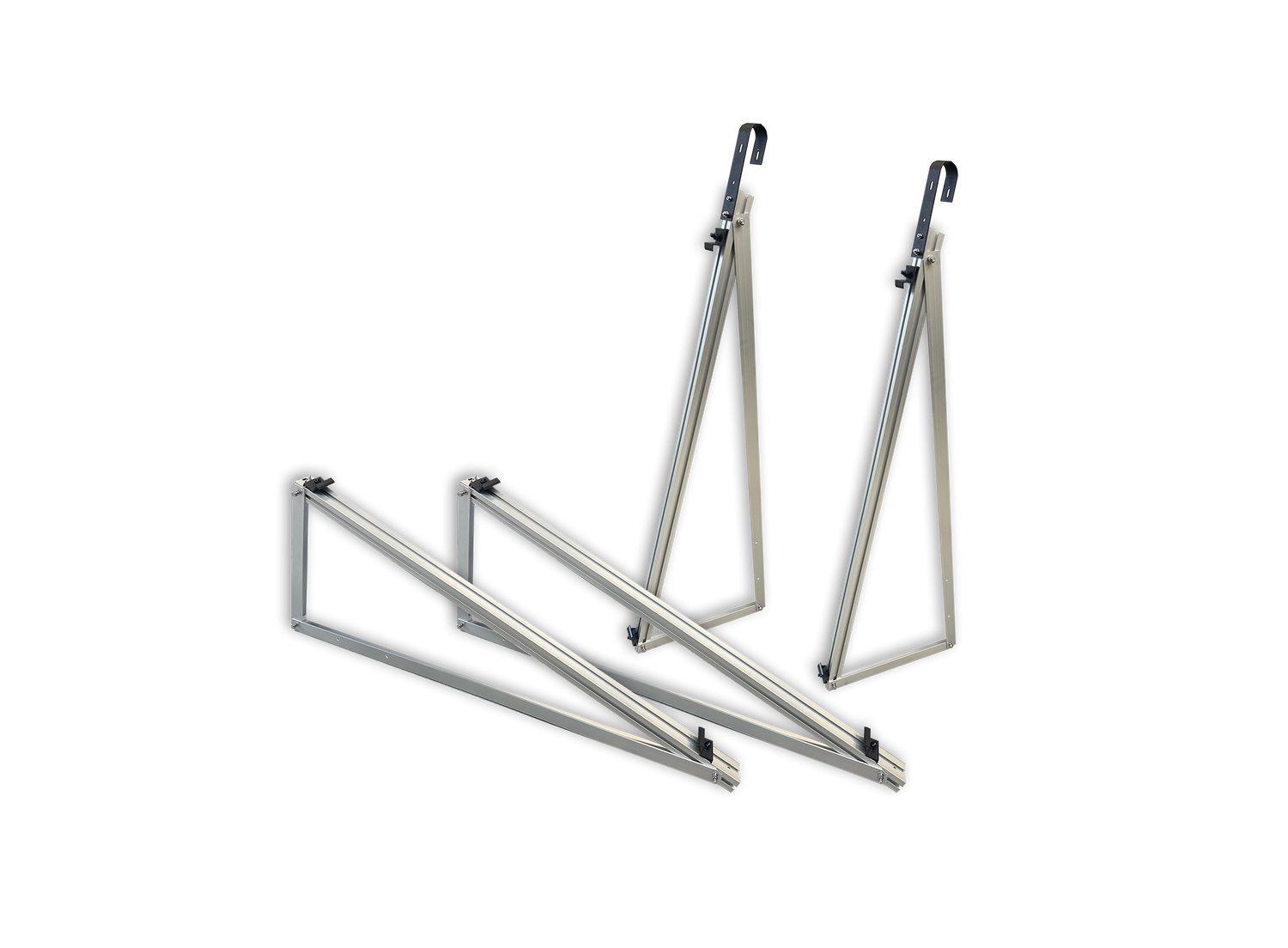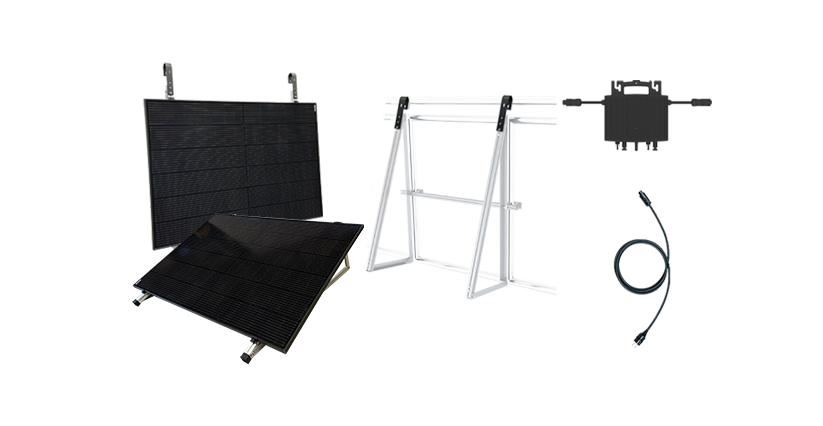 Per zonnepaneel bestaat de set uit twee verstelbare profielen en een dwarsprofiel, twee zwarte balkonhaken, zwarte moduleklemmen en alle benodigde schroeven en gereedschappen voor bevestiging aan balkons of plaatsing op een vlakke ondergrond (excl. ballasttegels).